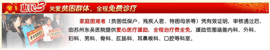 为了贯彻落实党中央、国务院关注民生精神,缓解物价上涨来就医压力,苏州东吴中西医结合医院响应上级号召,积极行动,开展“2011暖冬惠民行 动“,推出一系列医疗援助及优免项目,活动时间于2011年元月1日-31日,让广大市民及外来务工人员都能够过一个健康、祥和的新年!