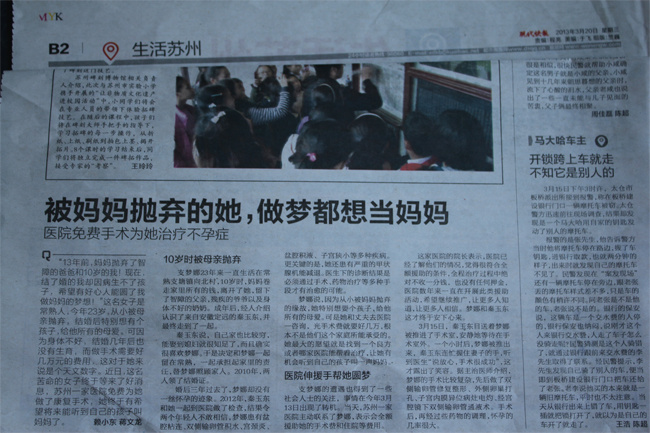 婚后三年过去了,梦娜却没有一丝怀孕的迹象。秦玉东想起了领证前,婚检工作人员说的话,他们说过梦娜的身体不是很好,希望他再考虑一下要不要领证,但玉东还是坚持领了证。直觉告诉他们,两个人身体肯定有问题。2012年,秦玉东和梦娜一起到苏州的一家医院做了检查,检查结果令两个年轻人不敢相信,梦娜患有盆腔粘连、双侧输卵管积水、宫颈炎、盆腔积液、子宫狭小等多种疾病,更关键的是还患有严重的甲状腺机能减退。医生下的诊断结果是必须通过手术、药物治疗等多种手段才有治了的可能。