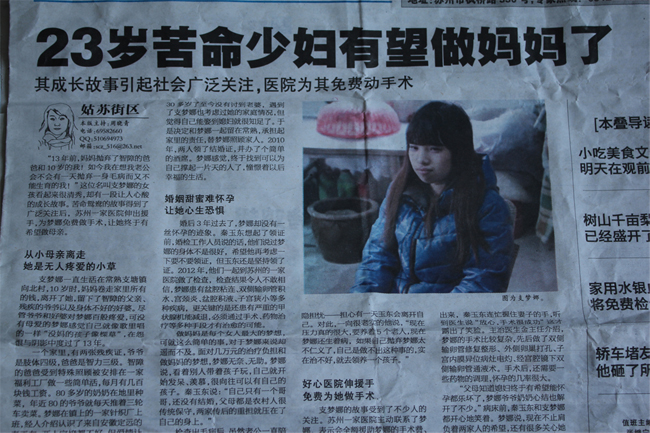 如今,一个家里,有两张残疾证,爷爷是肢体四级,爸爸是智力三级。幸好国家政策好,智障的爸爸受到特殊照顾被安排在一家福利工厂做一些简单活,每月有几百块钱工资。80多岁的奶奶在地里种菜,年近80的爷爷就每天推着三轮车到街上菜市场卖菜。梦娜在镇上的一家针织厂上班,经人介绍认识了来自安徽定远的秦玉东,俩人家境都不好,收入也很低,两人顶着很大的压力,走到了一起。