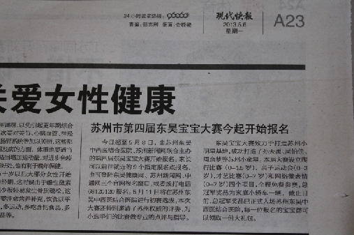 今日起至5月8日, 由苏州东吴中西医结合医院、苏州新闻网联合主办的第四届东吴宝宝大赛开始报名。本次大赛在东吴中西医结合医院、金宝贝早教、伊索儿童摄影等门店共设立9个指定报名点,家长可以前往就近的报名点报名,也可登陆东吴健康网(www.szdwyy.com)、苏州新闻网(subaonet.com)、中通网(www.cna.name)三个官网报名窗口,或者拨打电话68120120报名。5月11日将在苏州东吴中西医结合医院进行初赛选拔,本次大赛还特别邀请了苏州 的评委,为小选手们的比赛做 的点评与指导。