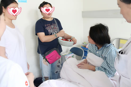 怀孕后的王女士和周女士一起去病房给患者发喜糖,她们一起分享孕育经历,告诉备孕的患者一定要注意自己的脾气,要保持心情舒畅,不要有太多心理压力。