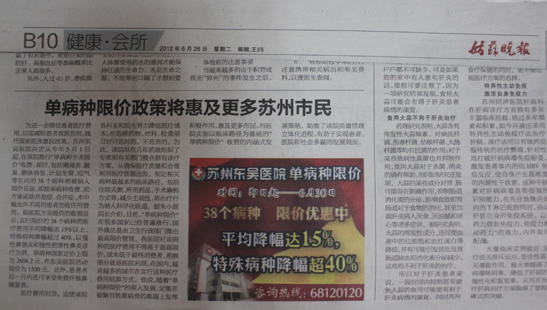 《姑苏晚报》单病种 政策将惠及更多苏州市民》