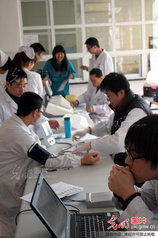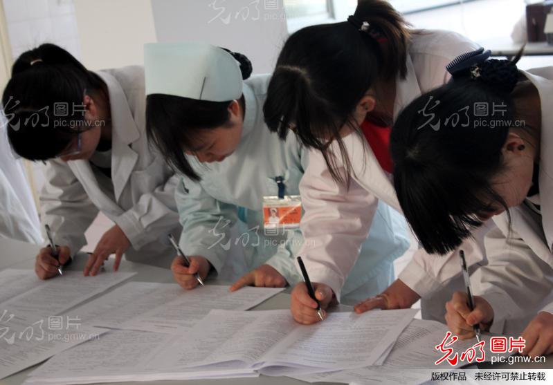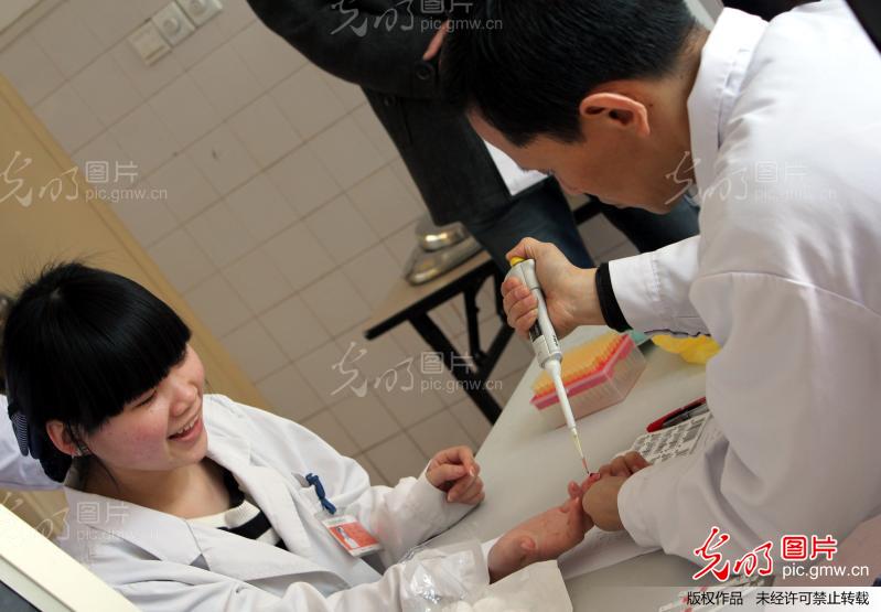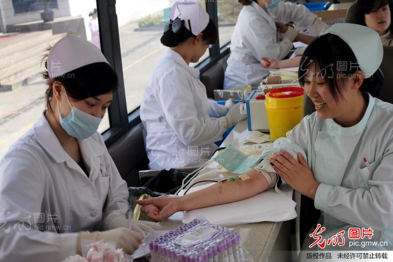 2013年3月6日,江苏苏州,苏州东吴中西医结合医院护士正在参加无偿献血。节后至今,苏州临床用血告急,苏州各大医院的医务人员积极参加无偿献血。