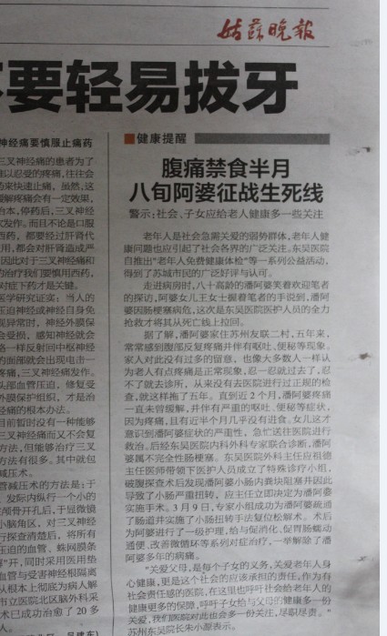 据了解,潘阿婆家住苏州友联二村,五年来,常常感到腹部反复疼痛并伴有呕吐、便秘等现象。家人对此没有过多的留意,也像大多数人一样认为老人有点疼痛是正常现象,忍一忍就过去了,忍不了就去诊所,从来没有去医院进行过正规的检查,就这样拖了五年。直到近2个月,潘阿婆疼痛一直未曾缓解,并伴有严重的呕吐、便秘等症状,因为疼痛,且有近半个月几乎没有进食。女儿这才意识到潘阿婆症状的严重性,急忙送往医院进行救治。后经东吴中西医结合医院内科外科医生联合诊断,潘阿婆属不完全性肠梗塞,考虑到潘阿婆已属高龄,症状紧急,生命垂危。东吴中西医结合医院外科主任应祖德主任医师带领下医护人员成立了特殊诊疗小组,破腹探查术后发现潘阿婆小肠内粪块阻塞并因此导致了小肠严重扭转,应主任立即决定为潘阿婆实施手术。3月9日,医生小组成功为潘阿婆疏通了肠道并实施了小肠扭转手法复位松解术。术后为阿婆进行了一级护理,给与促消化、促胃肠蠕动通便、改善微循环等系列对症治疗,一举解除了潘阿婆多年的病痛。