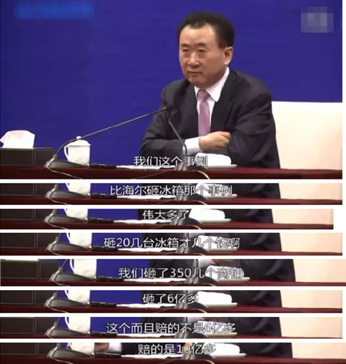 王健林在万达商学院上课时讲诚信,讲述太原街万达广场的一个视频,举例说到:当年我们赔了十个亿,比海尔砸几十台冰箱伟大多了!